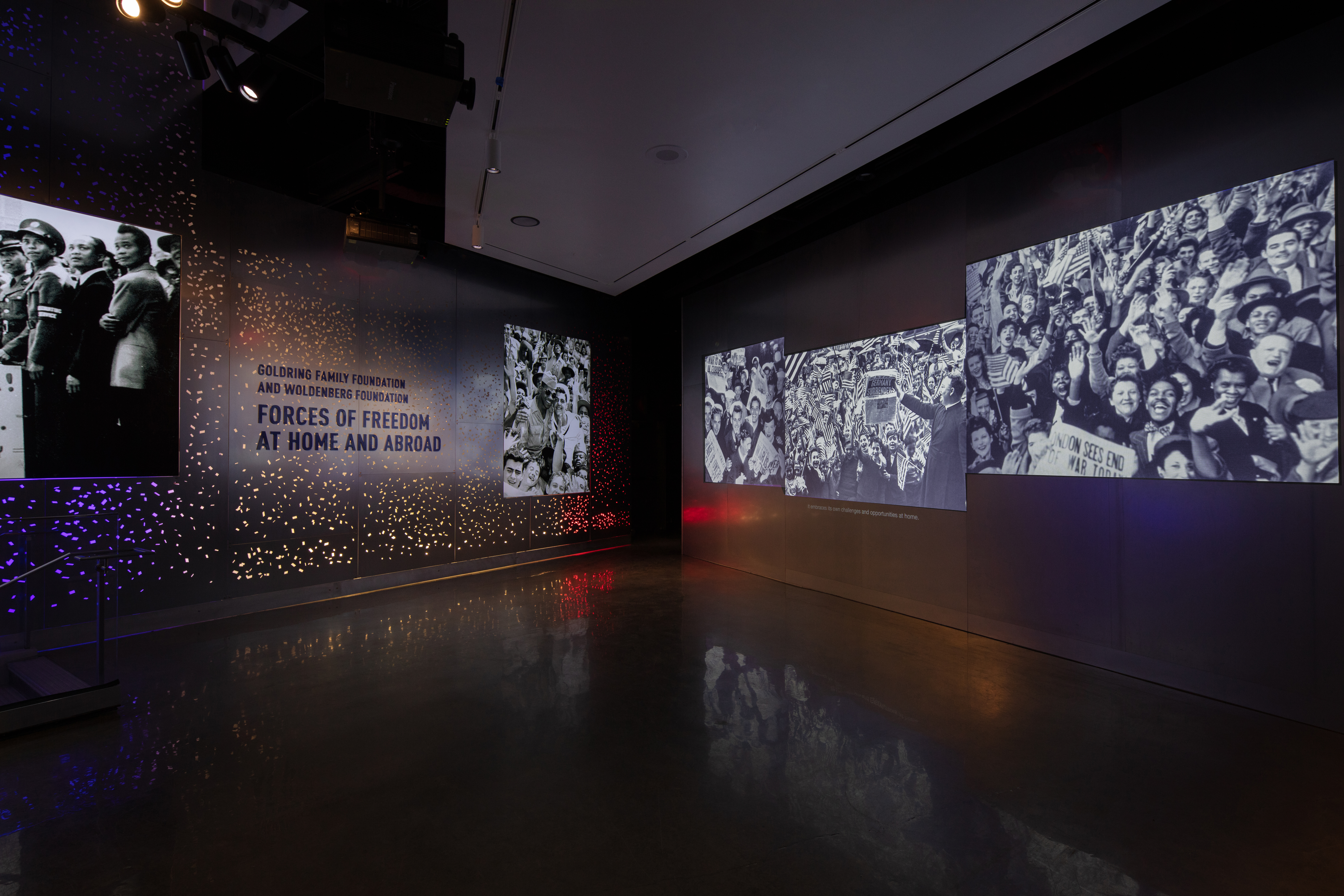The second floor of Liberation Pavilion, the Goldring Family Foundation and Woldenberg Foundation Forces of Freedom at Home and Abroad (1945–Present), explores the war’s impact in the postwar period and its lasting legacies today. Exhibits examine the rebuilding efforts of a world destroyed, the war crimes trials, the emergence of the US as a world “superpower,” movements for social change and civil rights, new technological innovations, and the war’s impact on foreign policy.
