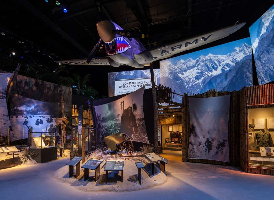 Beneath a restored P-40 Warhawk fighter plane, the Island Hopping: Footholds Across the Pacific gallery re-creates a landing site on the island of Tarawa to illustrate the “island-hopping” strategy that targeted key islands to capture and equip with airstrips, gradually bringing B-29 bombers—backed by naval and ground forces—within range of the enemy homeland. Other exhibits describe the integrated efforts of land, sea, and air forces, as well as successes in intelligence, technology, and carrier warfare in the fight for control of the skies. The adjacent China-Burma-India: The Pacific War’s Second Front gallery explores the critical strategic importance of that theater: while 11 Japanese army divisions battled US forces on the Pacific islands, a staggering 40 more Japanese divisions were tied up trying to subdue American allies in the China-Burma-India theater.