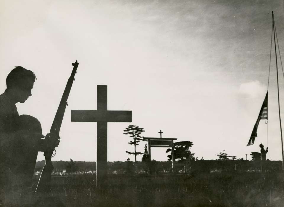 Top image: At the 1st Marine Division cemetery, a Marine kneels at the grave of a friend lost on Okinawa. US Marine Corps photograph. The National WWII Museum, Gift of Dylan Utley, Accession #2012.019.782
