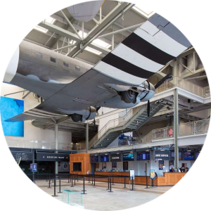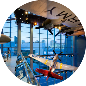 As you leave the Freedom Theater, you'll cross the Liberty Bridge and emerge on the top floor of US Freedom Pavilion: The Boeing Center (Building 5), the stunning home of six restored WWII planes and other iconic macro-artifacts. (10 minutes)
