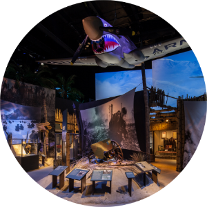 ...the state-of-the-art Campaigns of Courage pavilion (Building 3). This pavilion is made up of two immersive exhibits guiding visitors through the narrative of each theater of combat through the eyes of the American troops who fought there. Begin in the second-floor exhibit, Road to Tokyo: