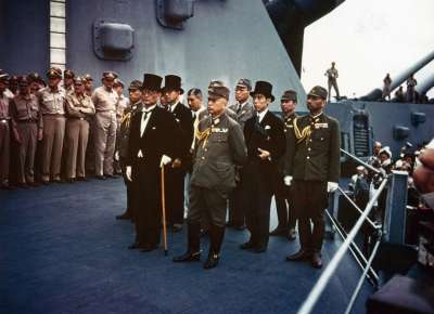 Top Photo: Japanese representatives on board USS Missouri (BB-63) during the surrender ceremonies, September 2, 1945. Photograph from the Army Signal Corps Collection in the U.S. National Archives.