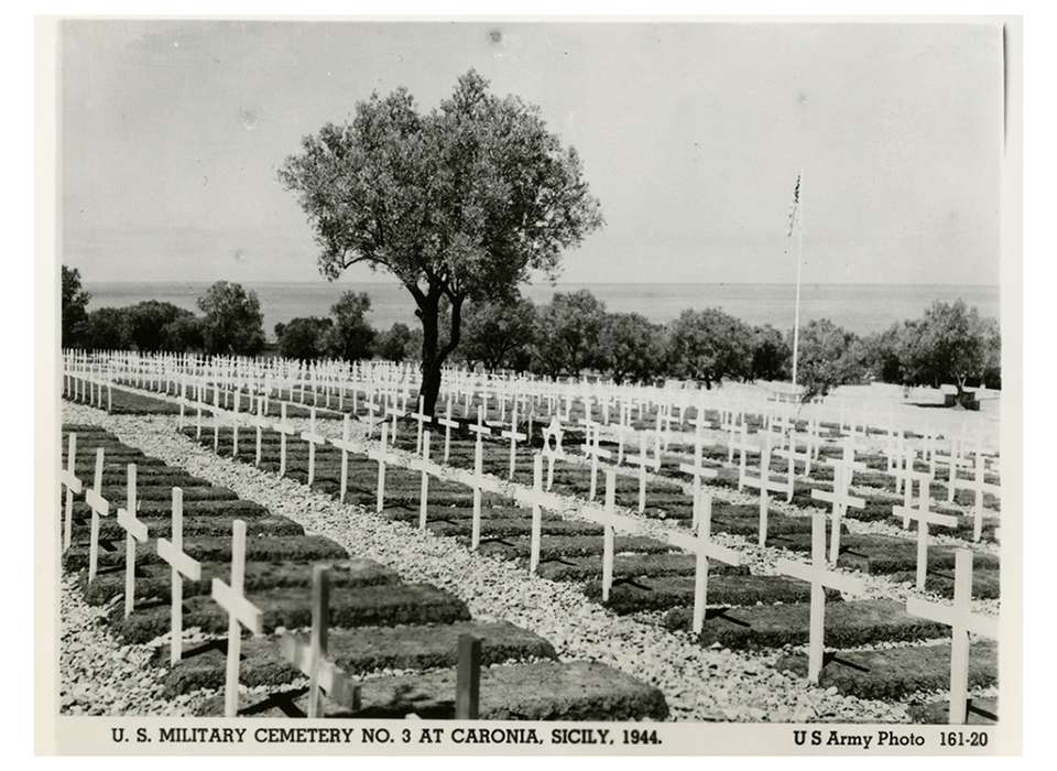 US Army Cemetery No. 3 at Caronia, Sicily. This image shows a temporary cemetery set up in Italy. Note the temporary grave sites with wooden crosses. Each temporary cemetery used local materials to landscape, making each one unique. The National WWII Museum, 2013.495.1098